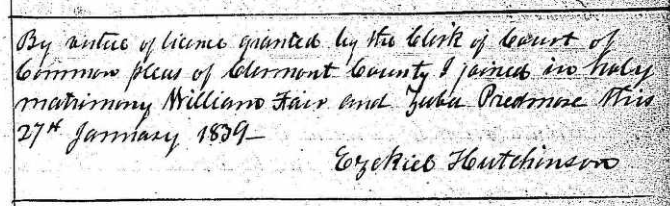 William married Azuba Predmore on January 27, 1839 in Clermont County, Ohio. Zuba Predmore was born in Monmouth, New Jersey in 1812. Her parents were Ephriam and Mary (Brown) Predmore. Azuba’s paternal grandmother was named Azuba Cramer Predmore. Zuby did not learn to write, when she and William took out a mortgage on their farm she signed the document with an X. In the summer of 1878 Zuby fell from a wagon, she was hurt pretty badly. She never really recovered and six months later, she died on January 24, 1879 of dropsy and heart trouble in Pleasant Township, Fulton County, Illinois. She was 57 years old.