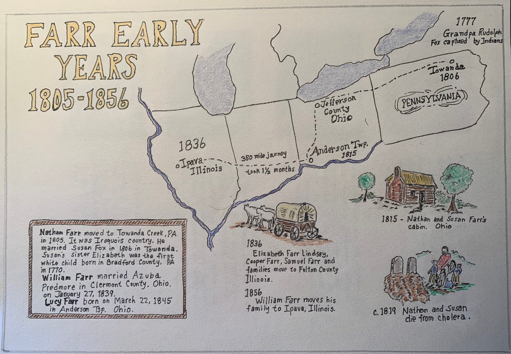In 1853, William Farr loaded his belongings and small children onto a wagon and set out on a long trek from Hamilton County, Ohio to Fulton County, Illinois. His brothers had left for Fulton County years before, and now he, his wife Zuby, and their children were following suit. The farm was sold and they were moving to Illinois, out West as people said.