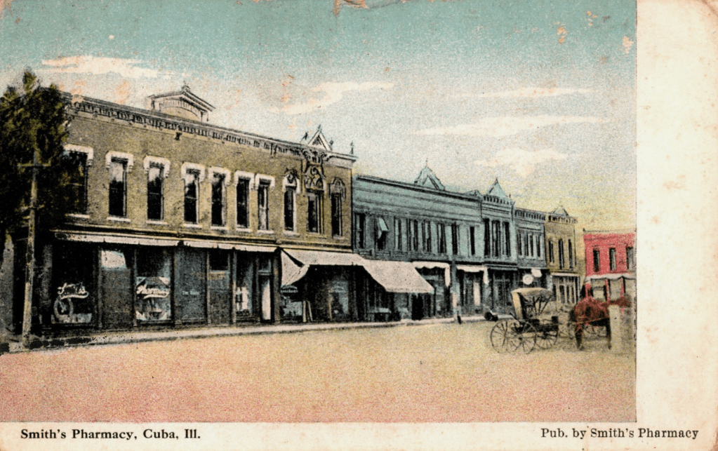 Drawing by Burris Pittman of the Pond Drug store in Ipava, Illinois in 1879.